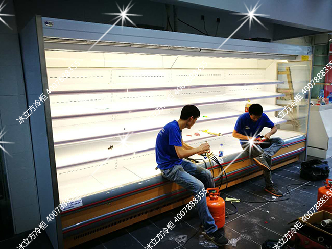 冰立方祝贺惠州金泓阁钱大妈生意兴隆日进斗金!钱大妈惠州金泓阁门店4.5米风幕柜安装中