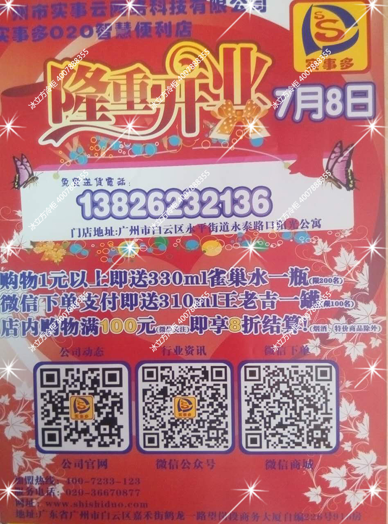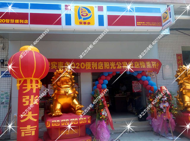 产品:四门分体带边框展示柜 型号:BLF-2600L4FY 地址:广州市白云区永平街道永泰路口阳光公寓 实事多020便利店阳光公寓分 冰立方祝贺:实事多便